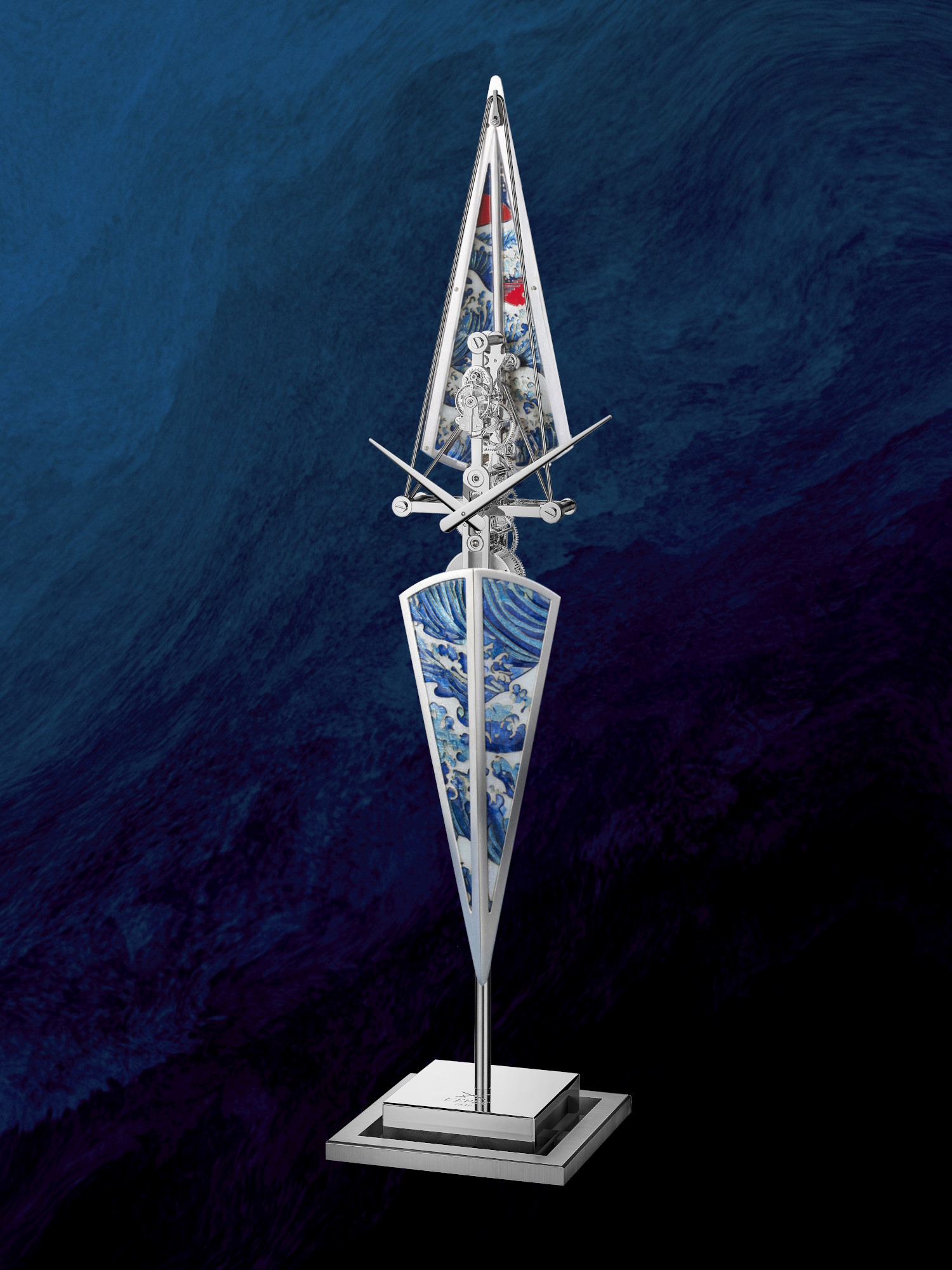 Cette horloge verticale dispose d’un esthétisme moderne et discret avec une silhouette en forme de skiff de compétition et une coque réalisée en émail Grand Feu bleu appliqué à la main par David Kakabadze Enamel, un atelier géorgien de renommée mondiale.