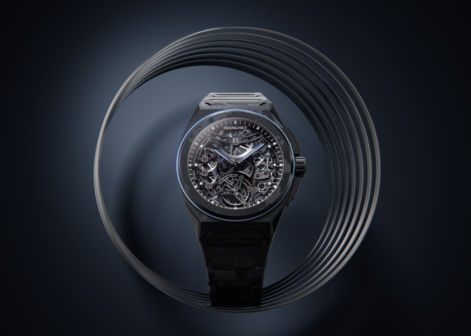 La maison Bianchet, spécialisée dans les montres tonneaux, présente une superbe montre ronde avec un calibre squelette tourbillon volant, l’UltraFino Rotondo. Ce garde-temps spectaculaire propose un boîtier rond de 39,5 mm avec, dedans, un calibre maison UR01 de seulement 3,85 mm d’épaisseur, 225 composants, une réserve de marche de 60 heures et un rotor en or rose 18 carats.