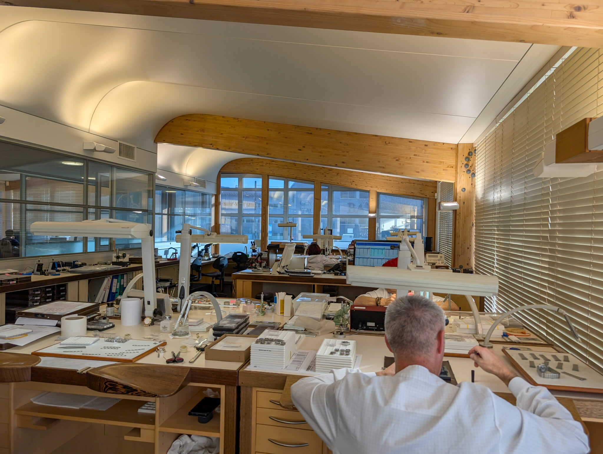 Nous montons ensuite à l’étage pour aller au cœur de la manufacture, l’atelier d’assemblage de la maison Pequignet. On y découvre plusieurs établis derrière lesquels se trouvent plusieurs horlogers qui vont chacun réaliser l’ensemble de leurs tâches :
