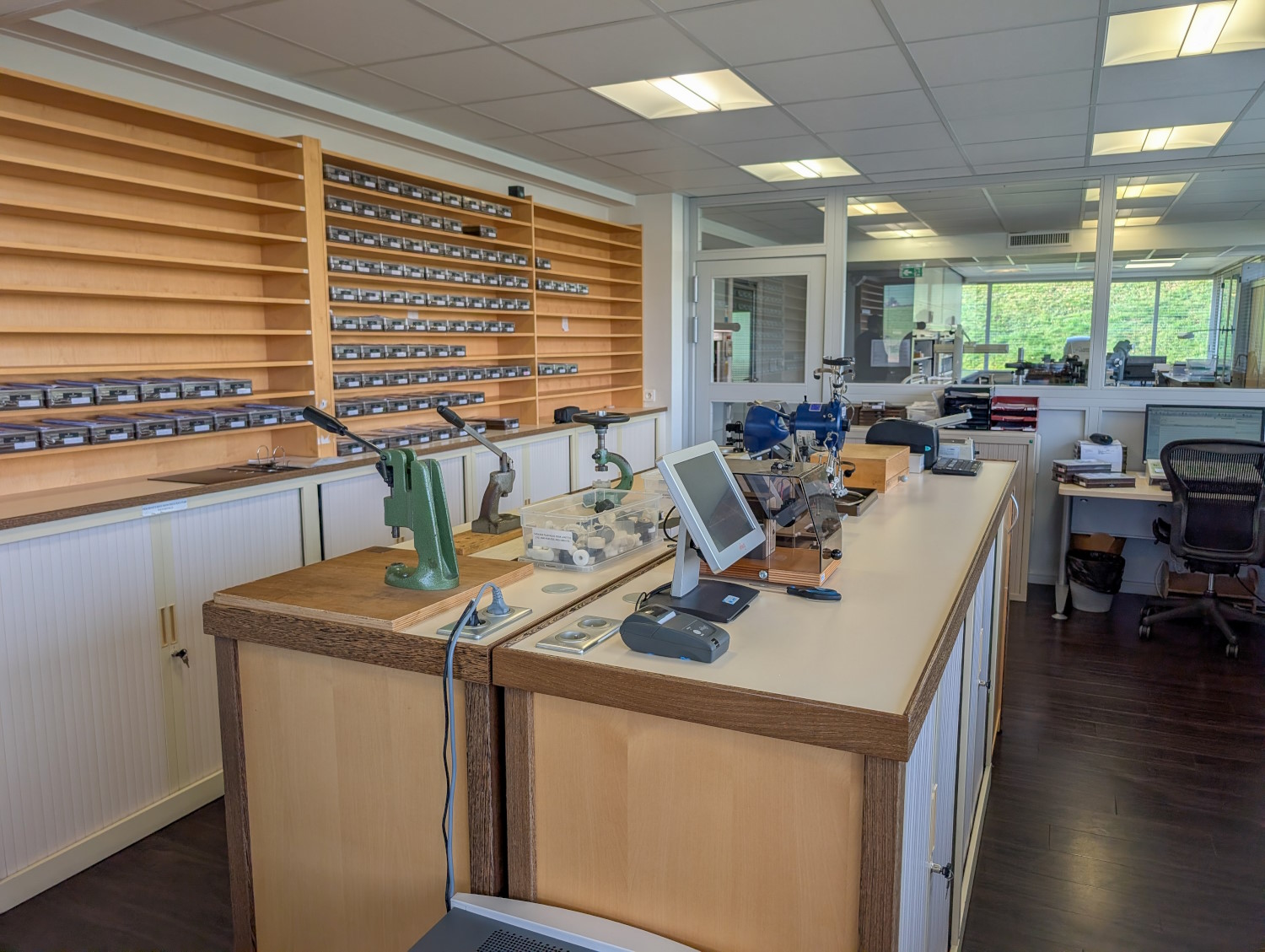 Juste à côté se trouve aussi une pièce qui permet de stocker l’ensemble des composants nécessaires à la fabrication des mouvements, mais aussi des machines de rodage qui vont permettre de fiabiliser les têtes de montres et leurs mouvements.