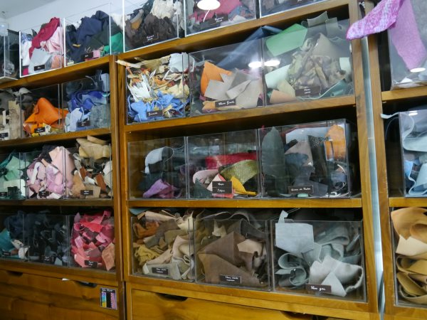 L’accueil est très chaleureux et ils décident de me montrer ce que propose leur boutique. On y trouve une multitude de choix de cuirs différents (près d’une cinquantaine, dont de l’alligator, du python, de l’autruche, du veau, de l’anaconda, de la perche du Nil ou du galuchat) disponibles dans différentes finitions (mat, brillant, tressé, imprimé, mélange cuir et caoutchouc, etc.) et colories que l’on pourra utiliser pour faire son propre bracelet de montre. L’avantage, c’est qu’ici sont présentées les peaux complètes, ce qui permet de choisir l’emplacement du cuir que l’on veut et même le grainage que l’on souhaite.