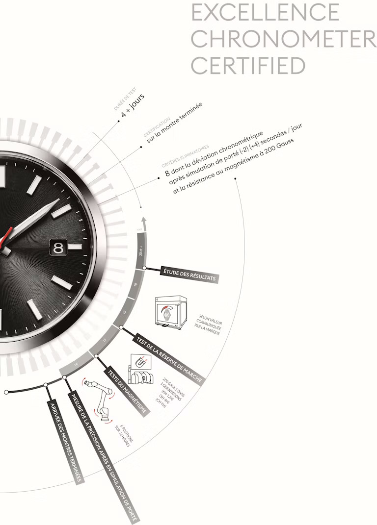 • Observatoire chronométrique de Genève : il certifie le respect de la normel 3159 et la certification OC+ qui va plus loin au niveau de l’étanchéité, la résistance au magnétisme ou durée de marche.