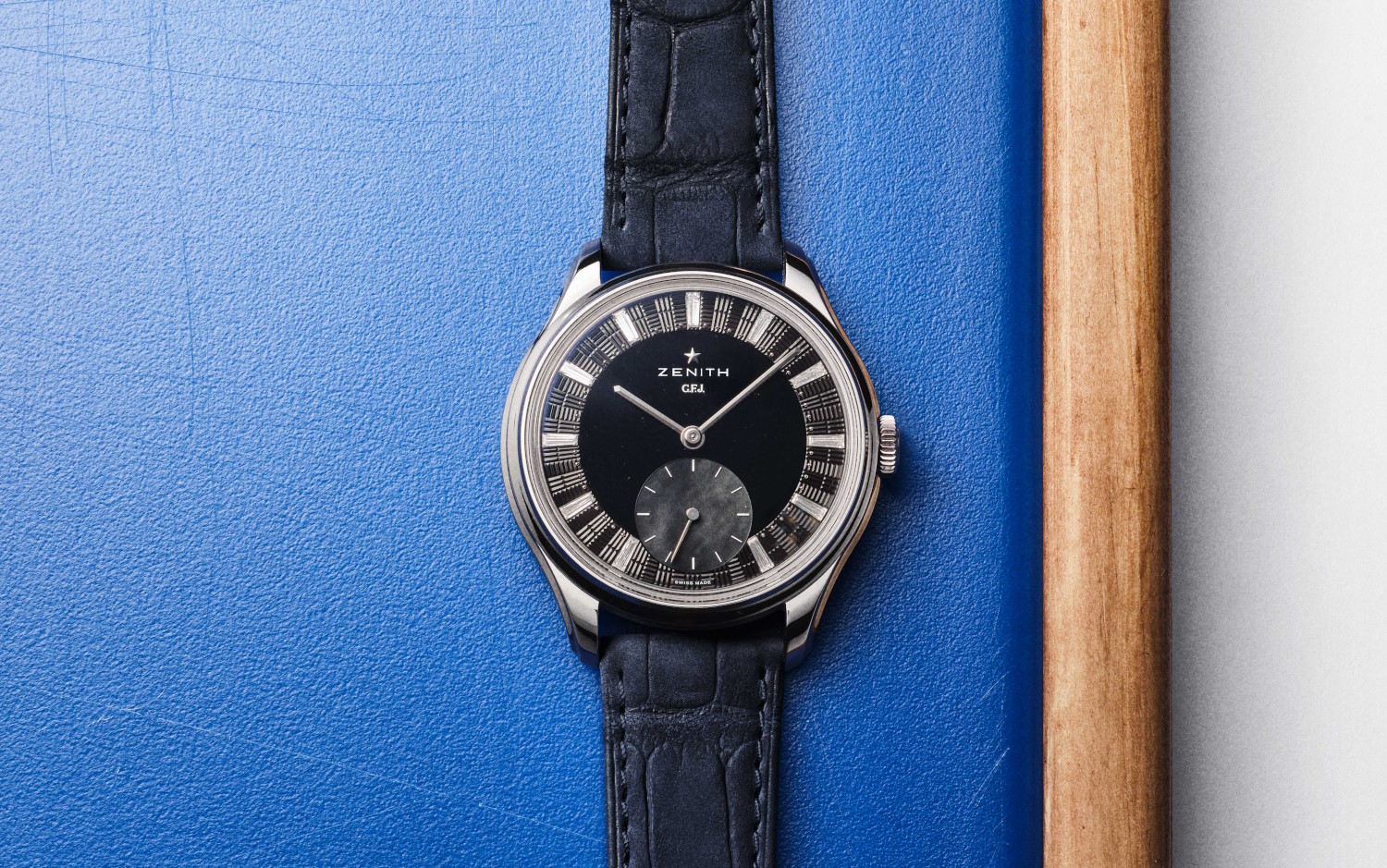 Zenith a présenté l’année dernière une nouvelle collection, la G.F.J. Cette année, l’une des grosses nouveautés de chez Zenith était l’apparition de cette montre mais dans une sublime version en tantale avec son cadran en onyx noir et petite seconde en nacre.