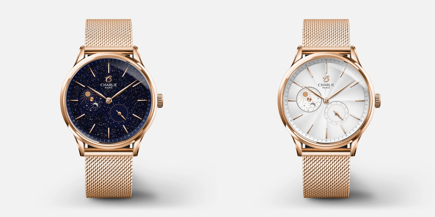 Cette belle montre signée de la maison parisienne Charlie Paris est très réussie avec son boîtier de 36 mm en PVD or rose. Son cadran est blanc soleillé ou bien en aventurine, et on y voit l’affichage du jour et de la nuit (avec le Soleil et la Lune), ainsi que la petite seconde. Le bracelet est en maille milanaise en PVD or rose et, à l’intérieur, on retrouve le mouvement automatique Miyota 82S7.