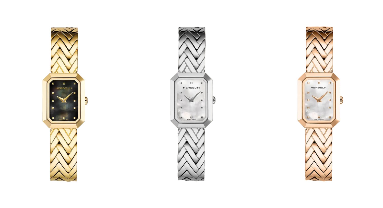 Il n’existe pas un seul Octogone chez Herbelin, mais plusieurs, et j’ai choisi ici la version avec son étonnant bracelet en forme de chevron. L’autre particularité de la montre, c’est son fin boîtier rectangulaire avec son cadran en nacre (blanche ou même noire). Le bracelet et le boîtier sont disponibles au choix en acier, en PVD or jaune ou en PVD or rose.