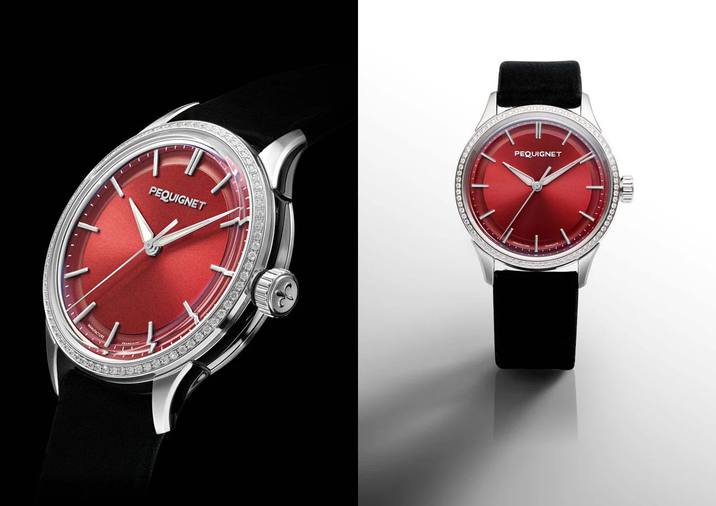 La maison française, connue pour ses mouvements manufacture de haute qualité (découvrir la manufacture Pequignet sur cette page), propose une nouvelle montre féminine (même si sa taille est unisexe), la Royale Paris 36 mm. Elle est sertie de 78 diamants avec un sublime cadran bordeaux soleillé.