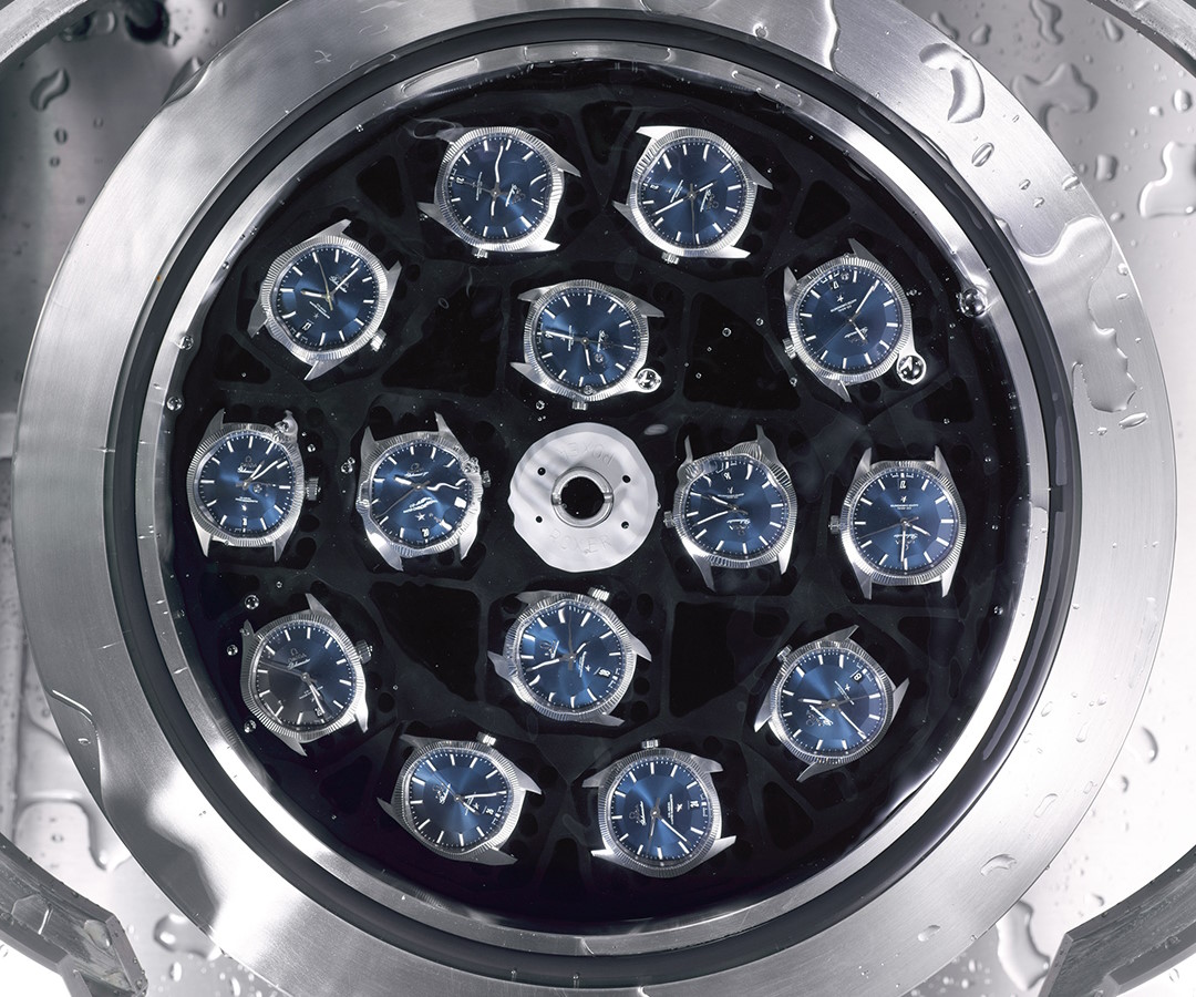 8. Étanchéité : un test est pratiqué en plongeant les montres dans l’eau pendant plusieurs minutes à plusieurs heures en respectant l’étanchéité indiquée sur la montre (25 % en plus pour les montres de plongée). Elles vont ensuite être sorties de l’eau et chauffées à 40 °C, puis une goutte d’eau est mise sur le verre saphir pour vérifier que de la buée ne se forme pas, ce qui indiquerait des problèmes d’étanchéité.