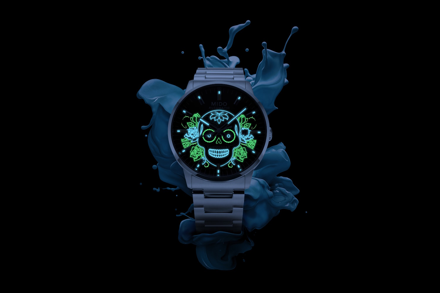 Le Día de los Muertos n’est pas qu’une fête mexicaine : c’est une célébration vibrante de couleurs, de symboles et d’émotions. Mido, la maison horlogère suisse, traduit cet héritage dans la série Commander depuis maintenant quelques années avec plusieurs éditions limitées en 2020 et 2024. On retrouve alors des montres avec la célèbre tête de mort souvent colorée comme il est courant d’en voir au Mexique pour cette fête, mais aussi avec une utilisation importante de la luminescence.