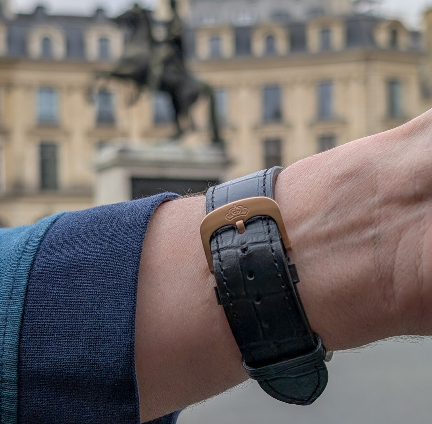 Pour finir, il faut parler du bracelet, de type intégré, qui est en cuir italien. Il est assez agréable à porter, mais sur ma montre de test, il est un peu large et a du mal à passer dans la boucle ardillon. Cette dernière est d’ailleurs assez belle, notamment avec le logo de la marque dessus.
