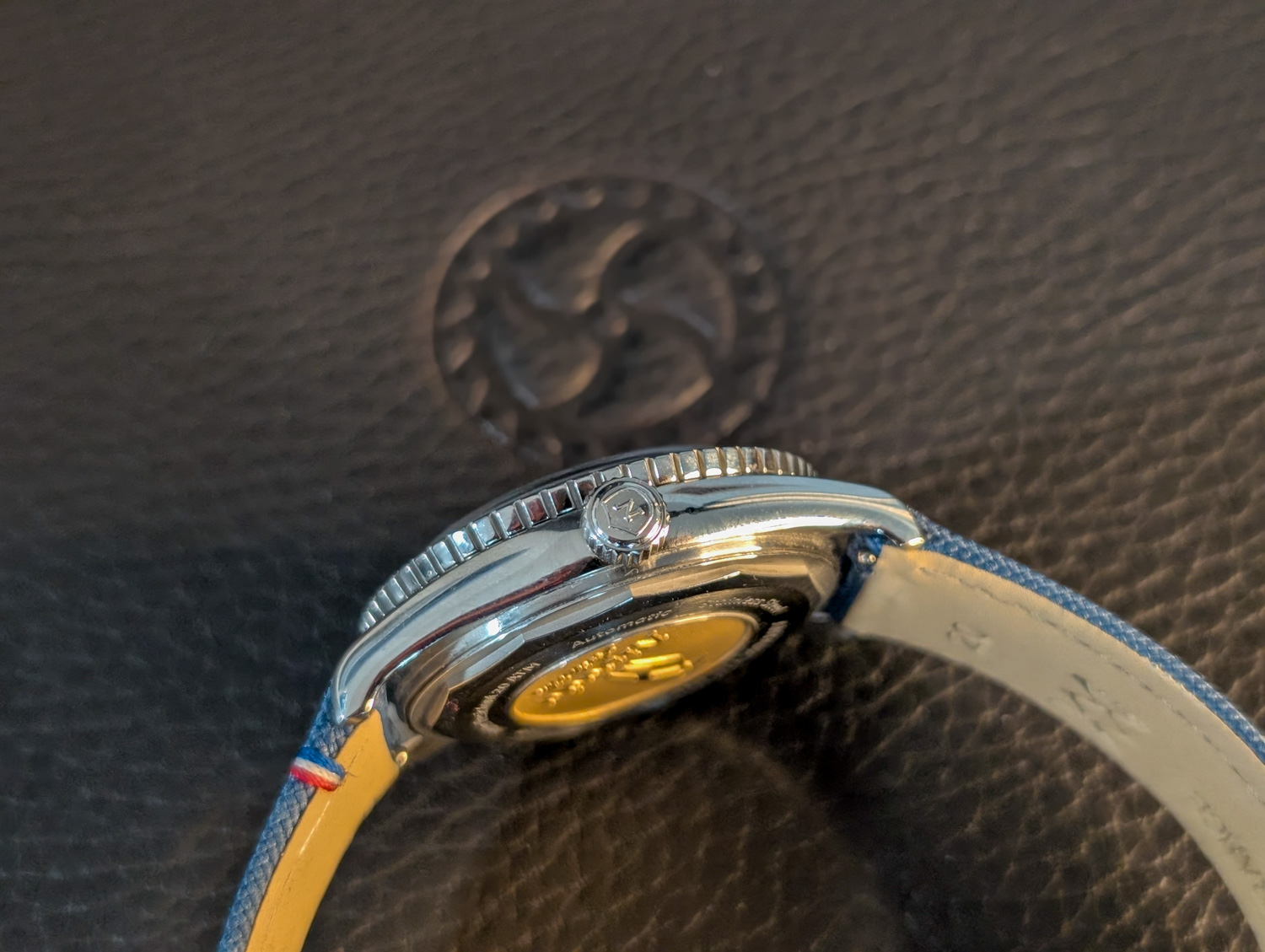 Au niveau du calibre, il s’agit du Soprod P024, qui offre une fréquence de 4 Hz, mais par contre seulement 28 800 alternances par heure. Il a l’avantage d’être fiable, mais par contre, il est un peu dur à remonter sur la version que j’ai.