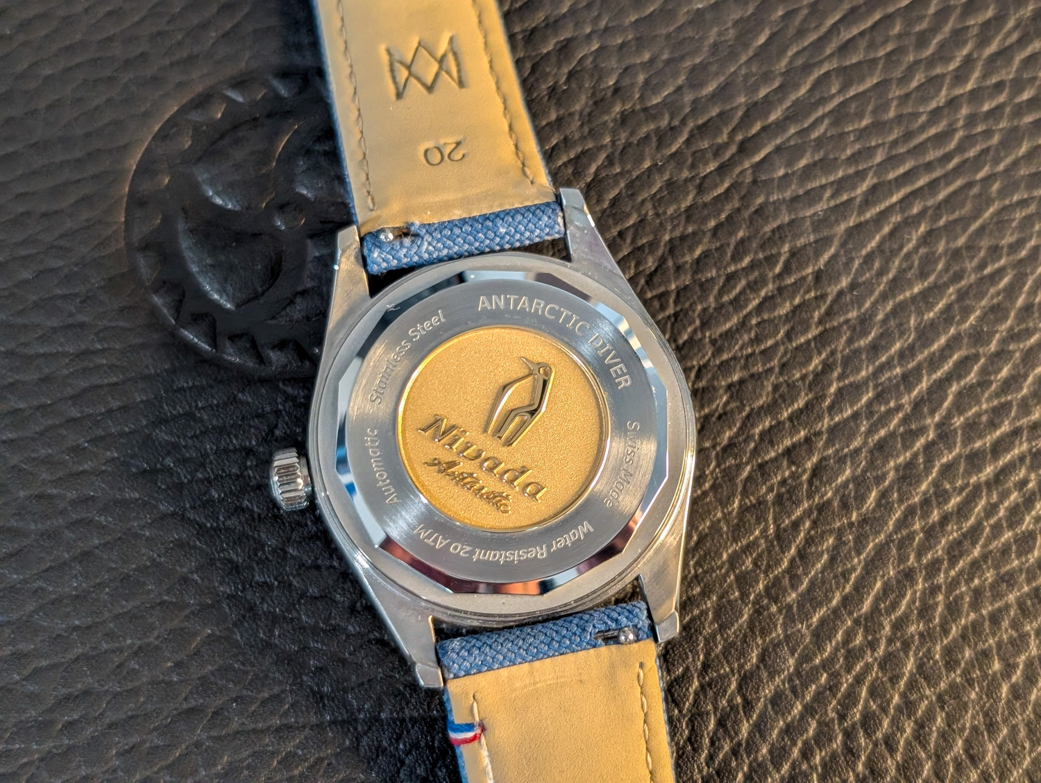 Pour finir, cette Skindiver dispose d’un fond plein avec un médaillon doré qui représente un manchot (d’où le nom de Antarctic) et est présent sur toutes ou presque les montres de cette collection.