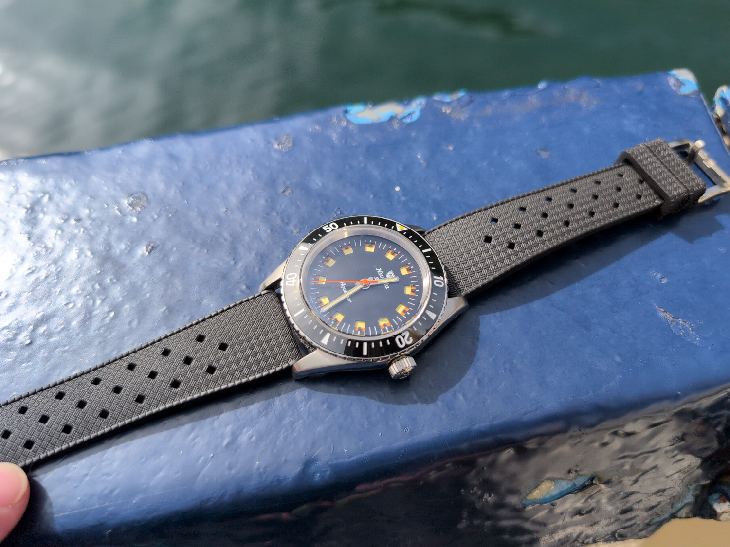 Au niveau de la montre testée, il s’agit de la référence avec cadran noir laqué sur bracelet rubber noir, même si je l’ai aussi montée sur le bracelet en toile de marine de chez Avel & Men.