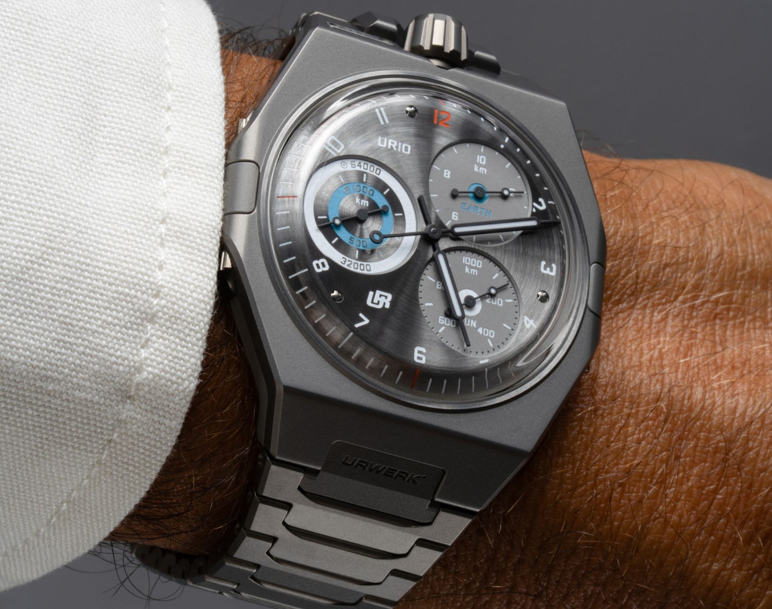 La UR-10 Spacemeter arbore un boîtier octogonal, une signature de la collection UR-100, mais revisité avec une épaisseur record de 7,13 mm (hors verres saphir). Ses dimensions généreuses (45,4 mm x 44 mm) ne nuisent pas au confort au poignet, grâce à son profil aminci. En titane sablé ou en acier inoxydable, ce boîtier mêle légèreté et robustesse. La couronne à 12 heures, un détail emblématique, renforce son identité visuelle.