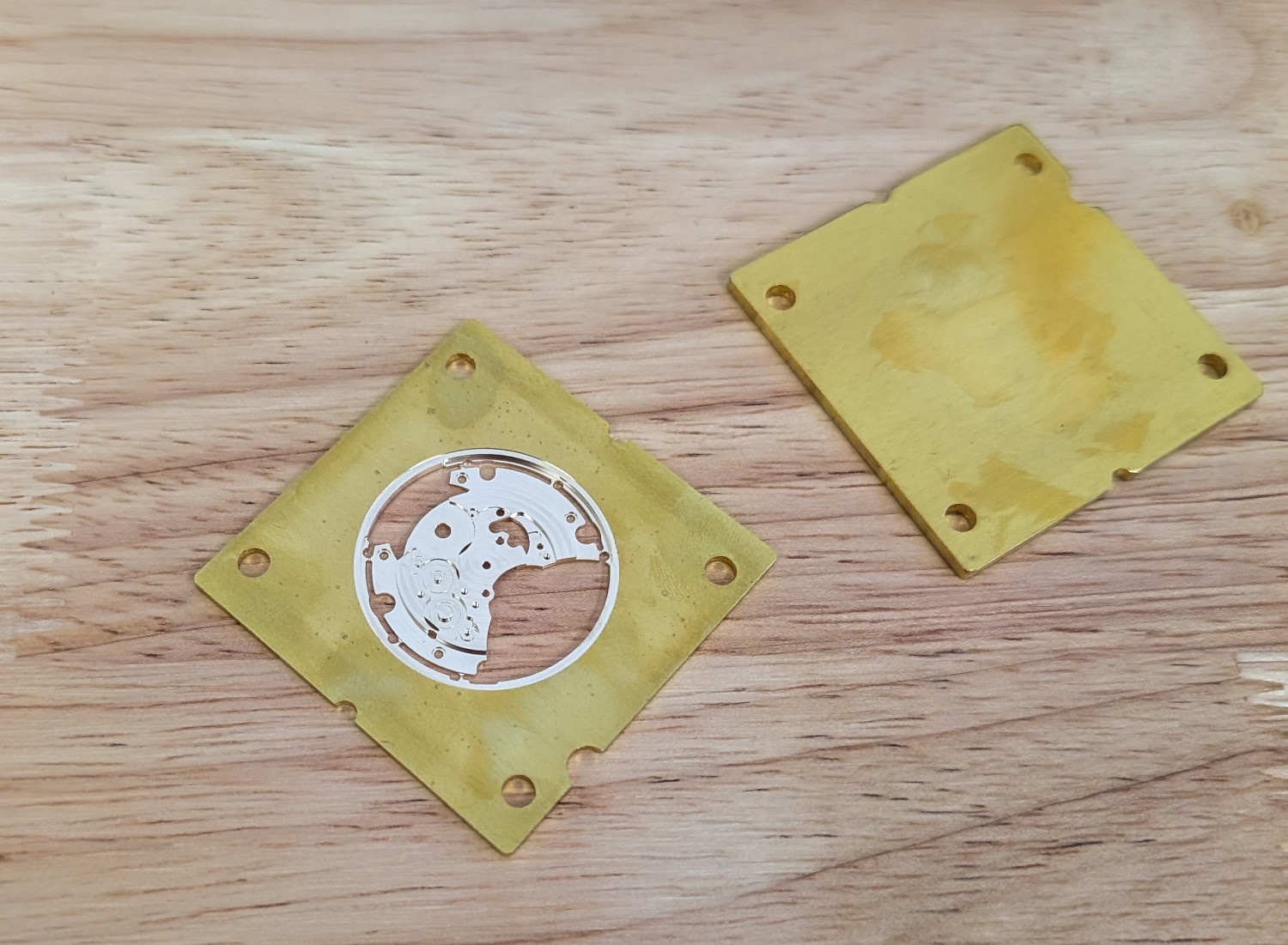 Elle va donc prendre des plaquettes en laiton avec un bras robotisé, et grâce à différents outils, elle va les transformer en pièces beaucoup plus petites en découpant, perçant, fraisant ou en enlevant de la matière pour, à la fin, donner une platine ou des ponts qui serviront à la fabrication des différents calibre CMM.