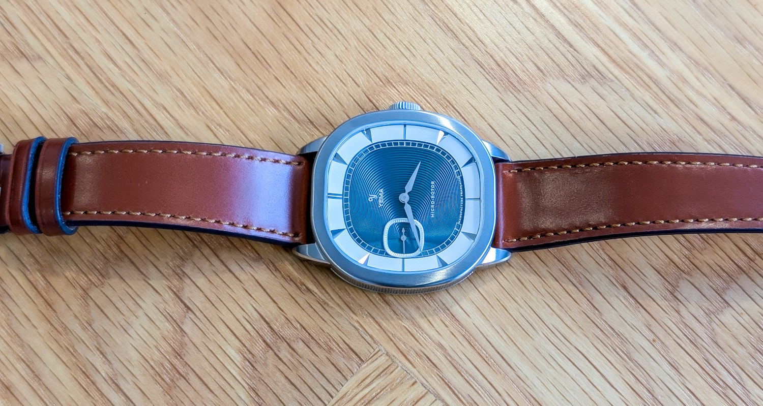 C’est au tour ensuite de la montre élégante de chez Yema, la belle Granvelle, qui s’inspire des formes du palais de Granvelle à Besançon. Cette montre de forme chic dispose d’un boîtier de 39 mm aux belles finitions et d’un cadran avec motif guilloché concentrique et petite seconde à 9 heures, ainsi qu’un réhaut assez imposant.